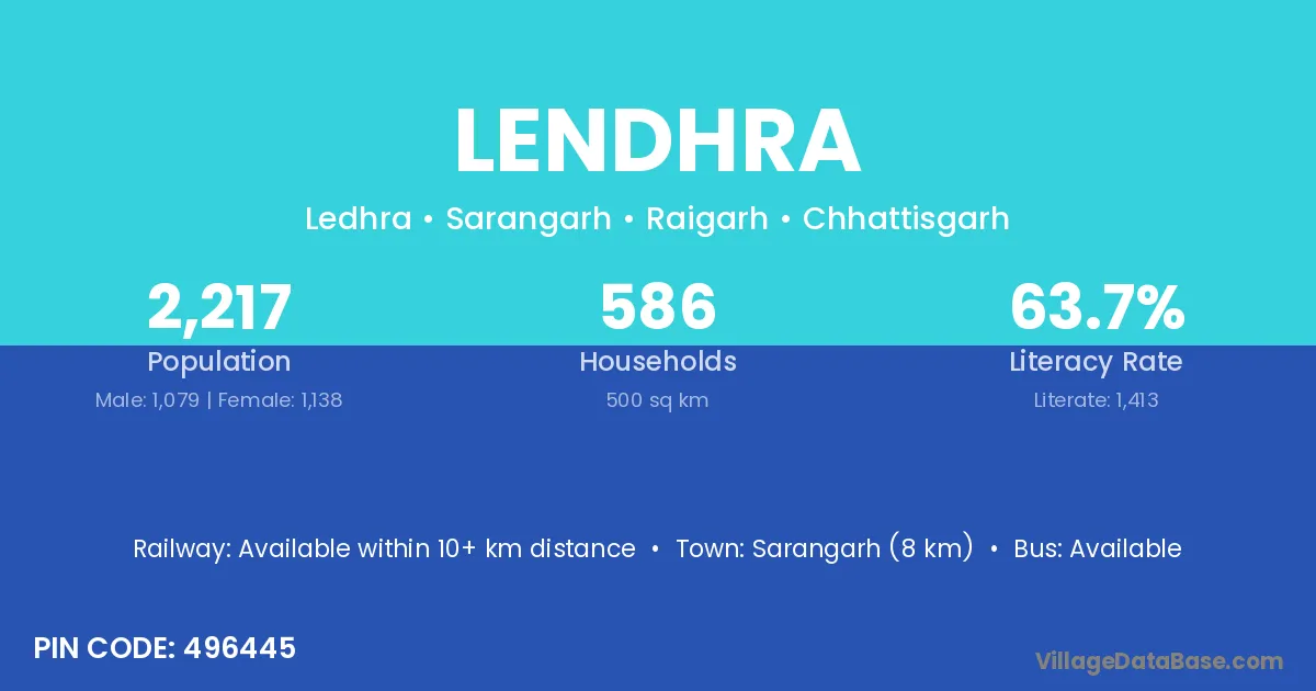 Sarangarh (8 km) is the nearest town to Lendhra village for major economic activities and is located approximately 8 km away.