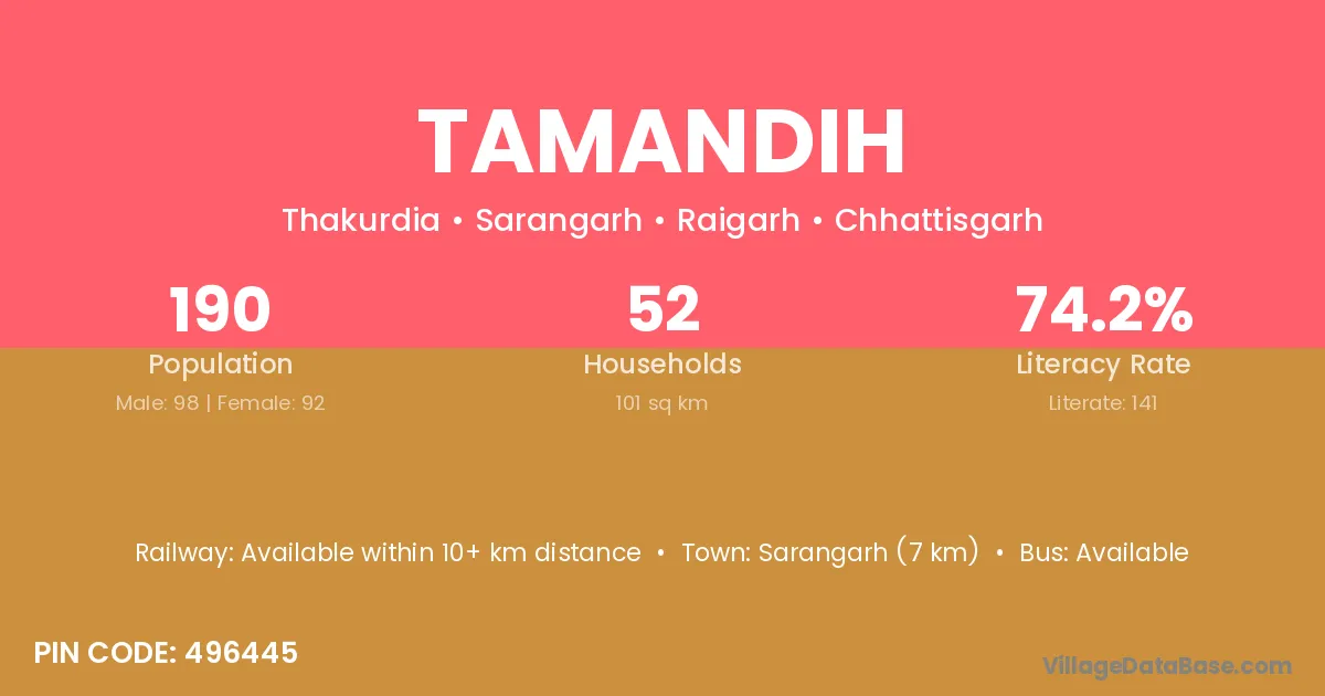 Sarangarh (7 km) is the nearest town to Tamandih village for major economic activities and is located approximately 7 km away.