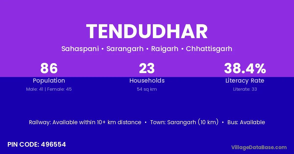 Sarangarh (10 km) is the nearest town to Tendudhar village for major economic activities and is located approximately 10 km away.