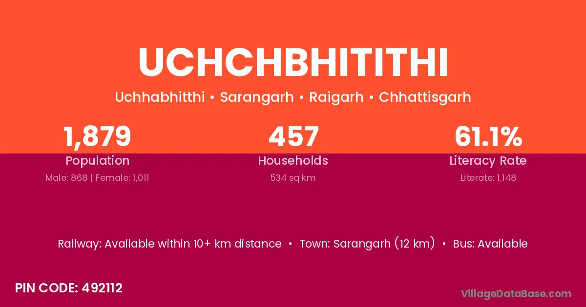 Sarangarh (12 km) is the nearest town to Uchchbhitithi village for major economic activities and is located approximately 12 km away.