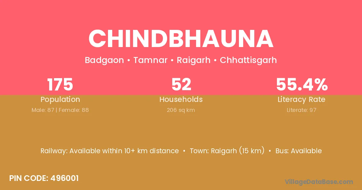 Raigarh (15 km) is the nearest town to Chindbhauna village for major economic activities and is located approximately 15 km away.