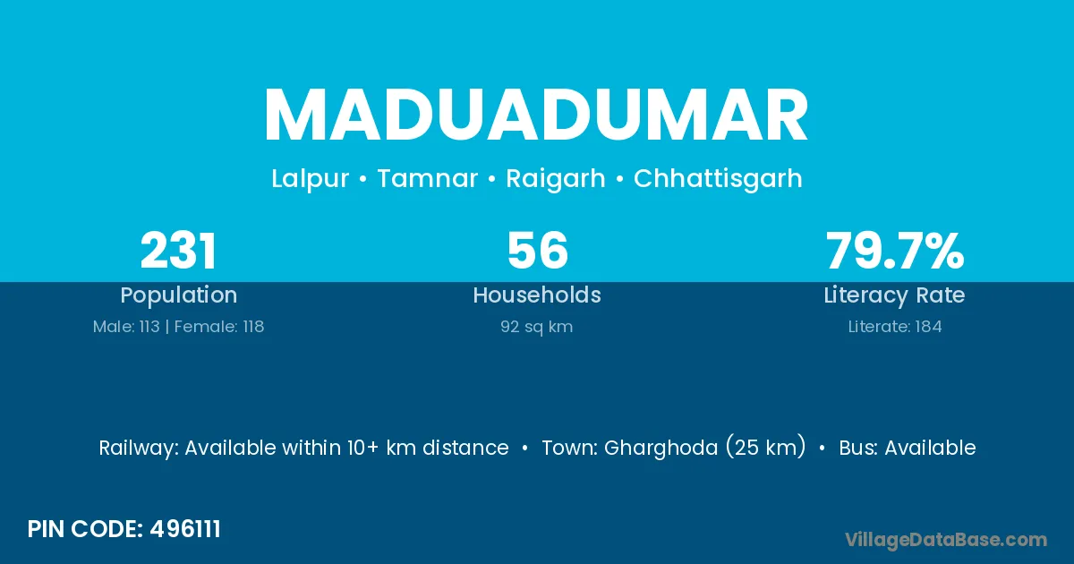 Maduadumar village has a total population of 231 people, of which 113 are males and 118 are females.