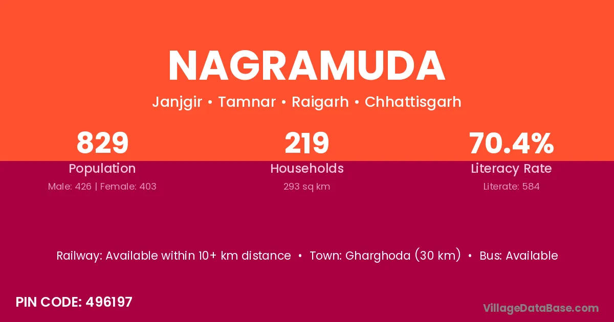 Gharghoda (30 km) is the nearest town to Nagramuda village for major economic activities and is located approximately 30 km away.