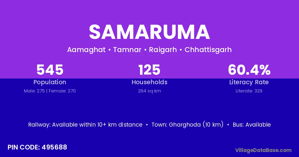 Gharghoda (10 km) is the nearest town to Samaruma village for major economic activities and is located approximately 10 km away.