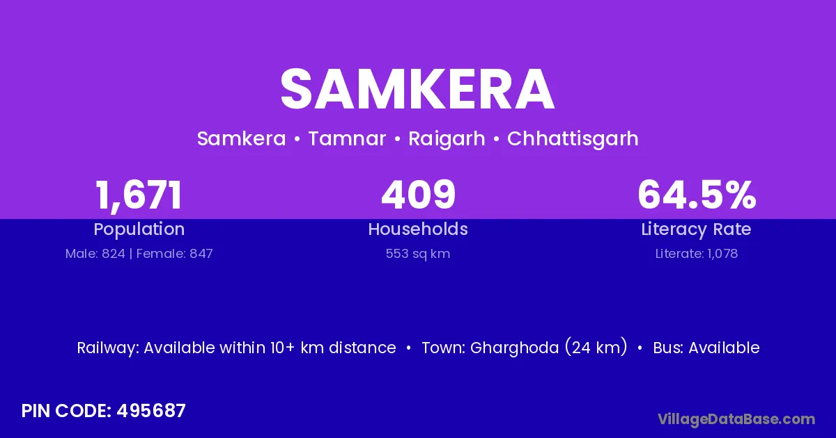 Gharghoda (24 km) is the nearest town to Samkera village for major economic activities and is located approximately 24 km away.
