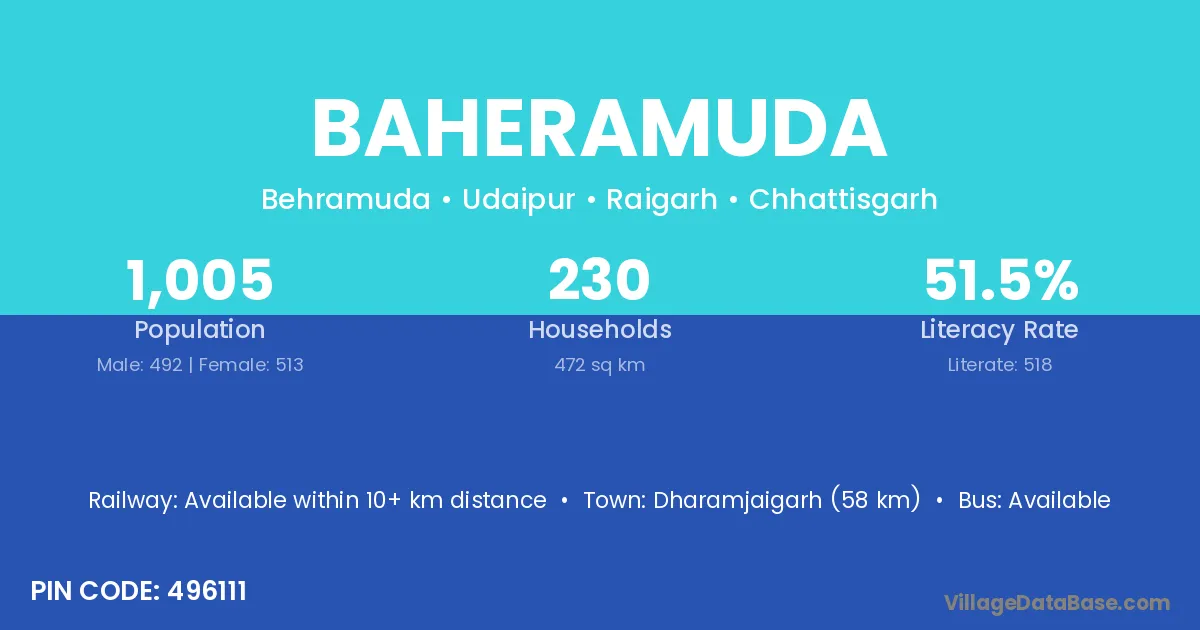 Dharamjaigarh (58 km) is the nearest town to Baheramuda village for major economic activities and is located approximately 58 km away.