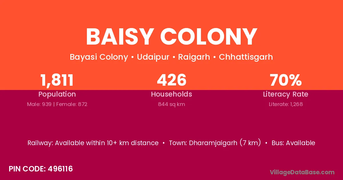 Dharamjaigarh (7 km) is the nearest town to Baisy Colony village for major economic activities and is located approximately 7 km away.