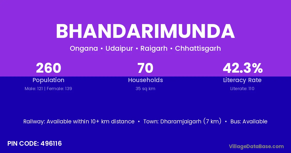 Dharamjaigarh (7 km) is the nearest town to Bhandarimunda village for major economic activities and is located approximately 7 km away.