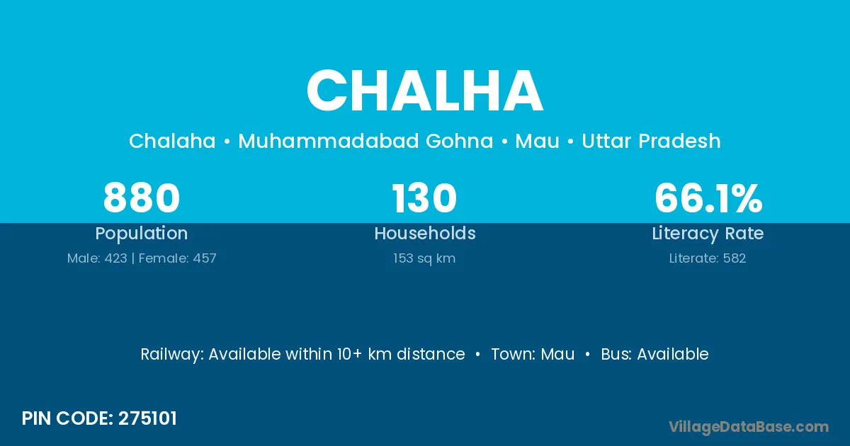 The literacy rate of Chalha village is 43.84%. Male literacy stands at 53.95% and female literacy at 33.66%.