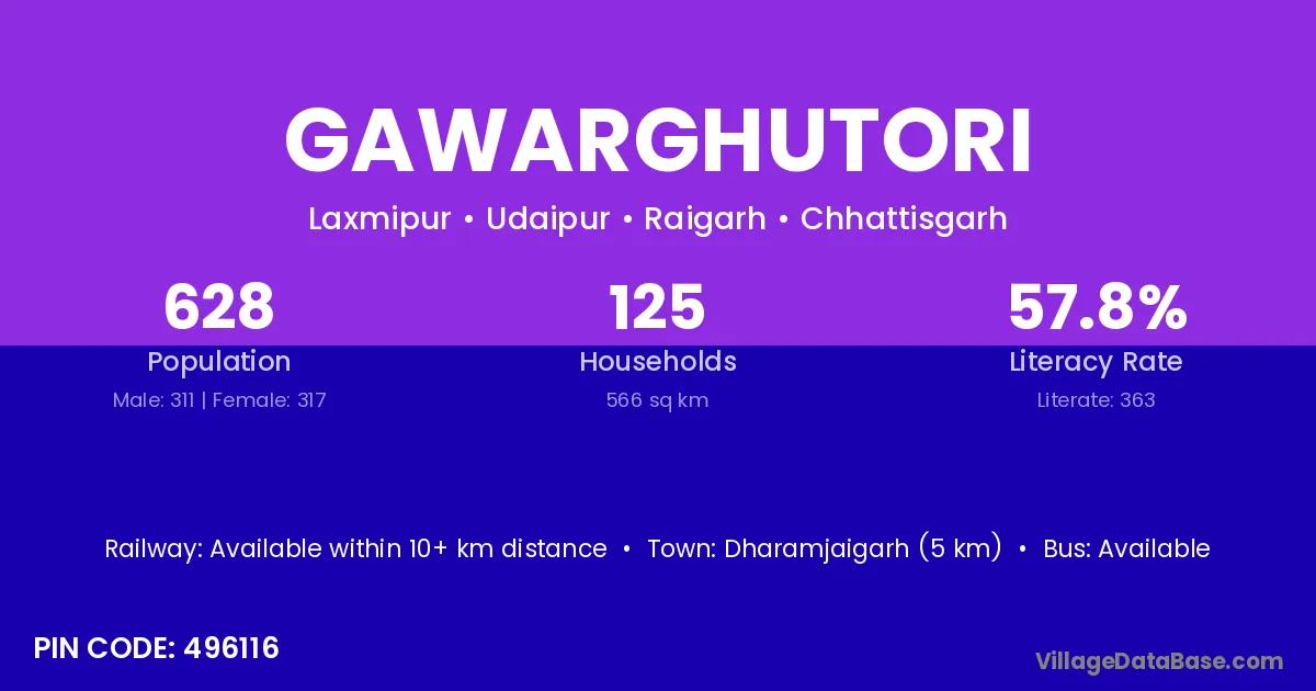 Dharamjaigarh (5 km) is the nearest town to Gawarghutori village for major economic activities and is located approximately 5 km away.