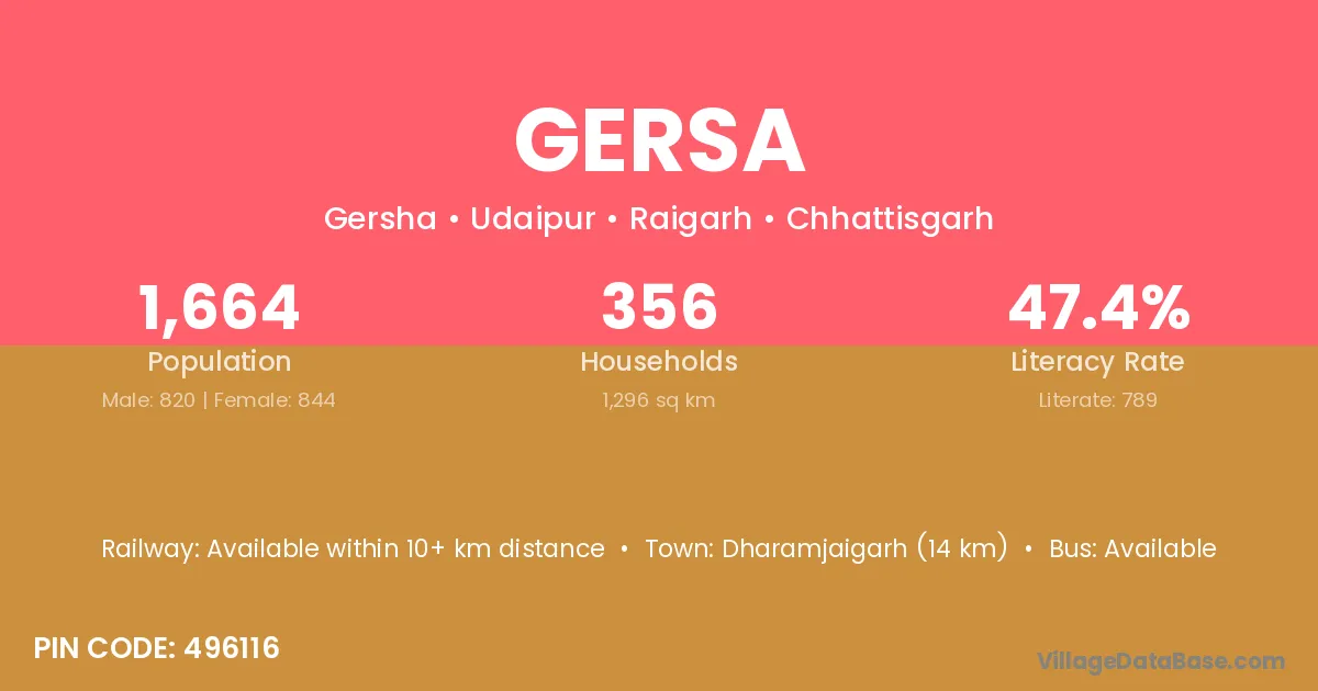 Dharamjaigarh (14 km) is the nearest town to Gersa village for major economic activities and is located approximately 14 km away.