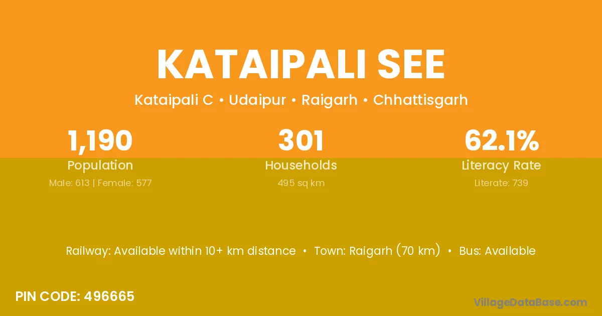 Kataipali See village has a total population of 1,190 people, of which 613 are males and 577 are females.