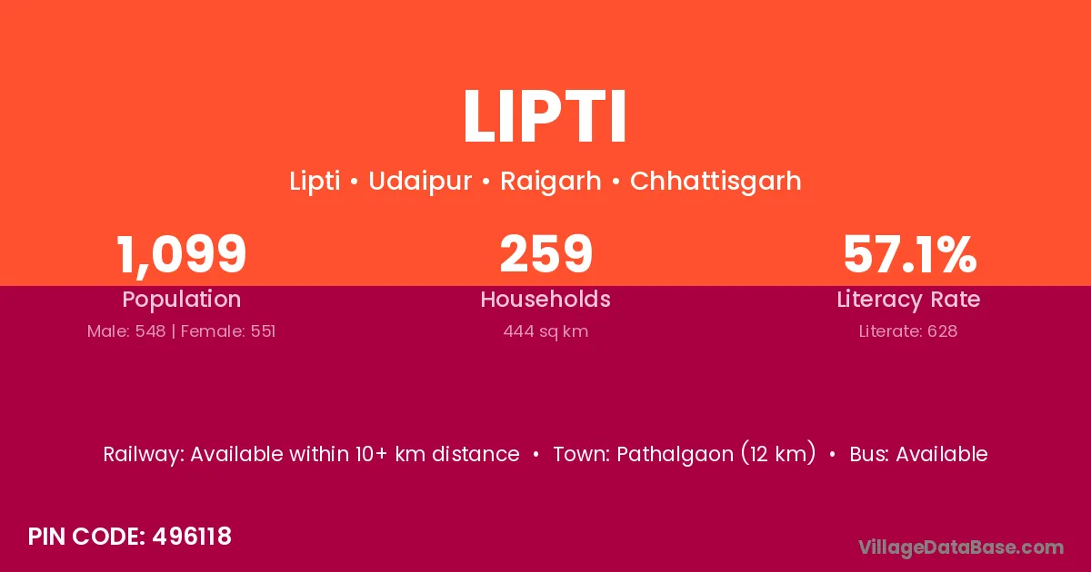 Pathalgaon (12 km) is the nearest town to Lipti village for major economic activities and is located approximately 12 km away.