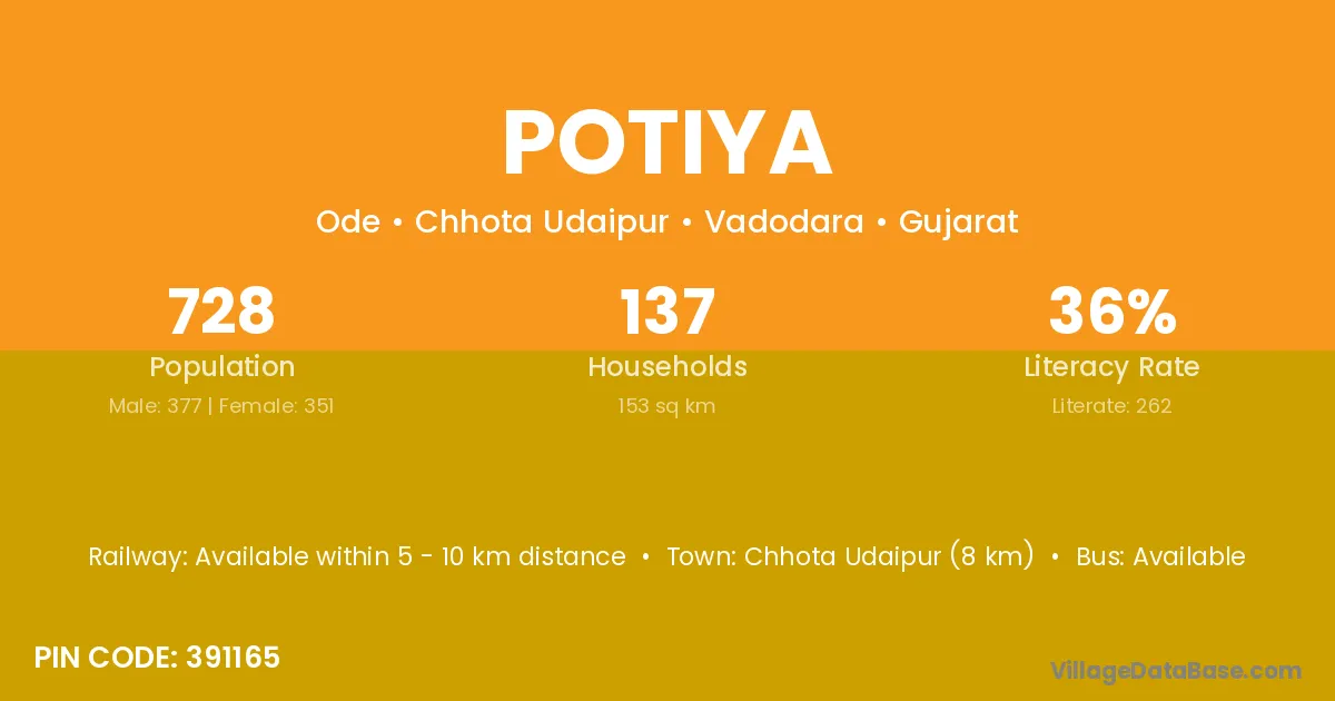 Dharamjaigarh (14 km) is the nearest town to Potiya village for major economic activities and is located approximately 14 km away.