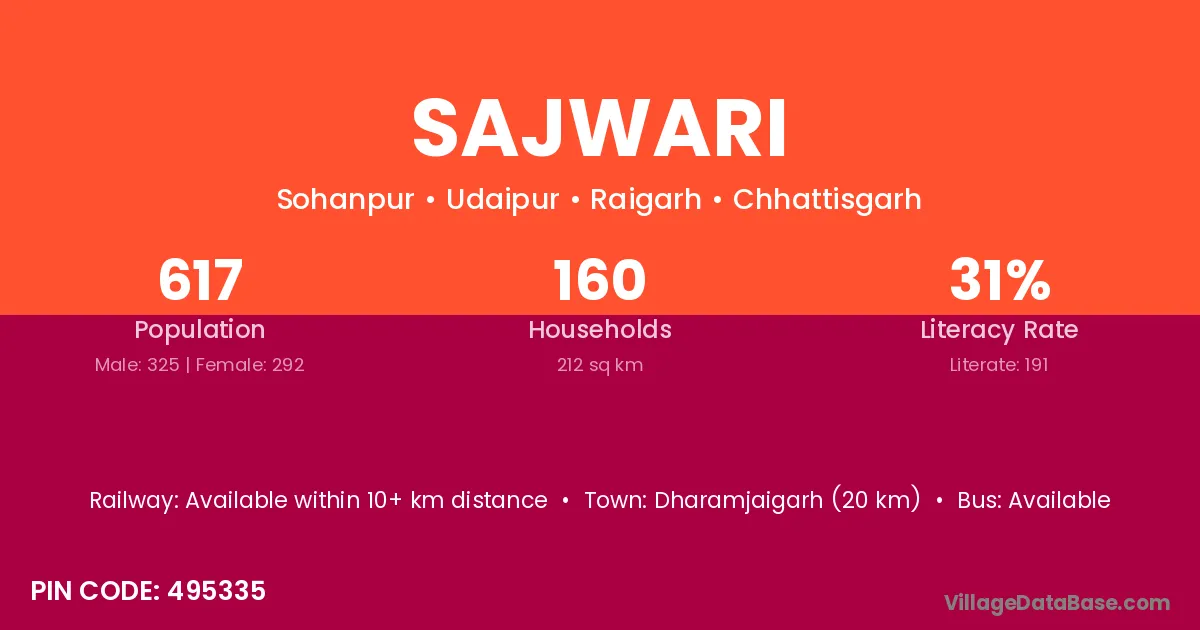 Dharamjaigarh (20 km) is the nearest town to Sajwari village for major economic activities and is located approximately 20 km away.