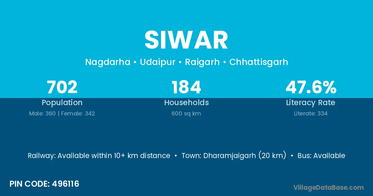 Dharamjaigarh (20 km) is the nearest town to Siwar village for major economic activities and is located approximately 20 km away.