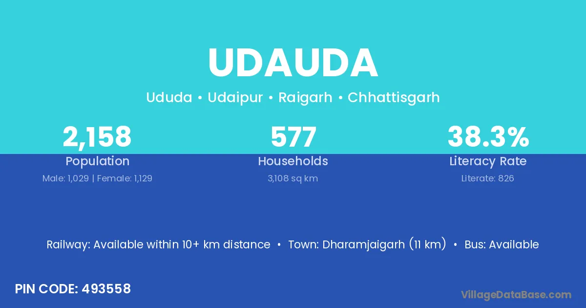 Dharamjaigarh (11 km) is the nearest town to Udauda village for major economic activities and is located approximately 11 km away.