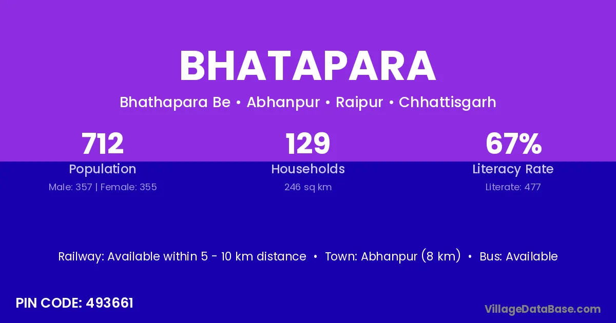 Bhatapara village has a total population of 712 people, of which 357 are males and 355 are females.