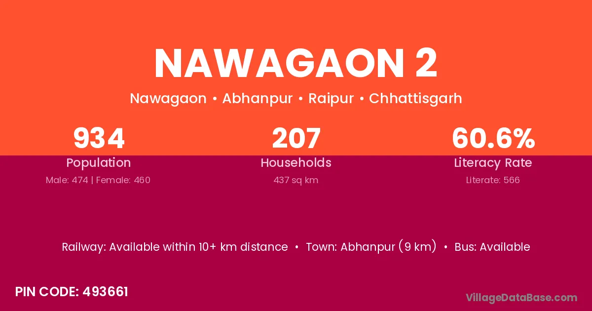 Abhanpur (9 km) is the nearest town to Nawagaon 2 village for major economic activities and is located approximately 9 km away.