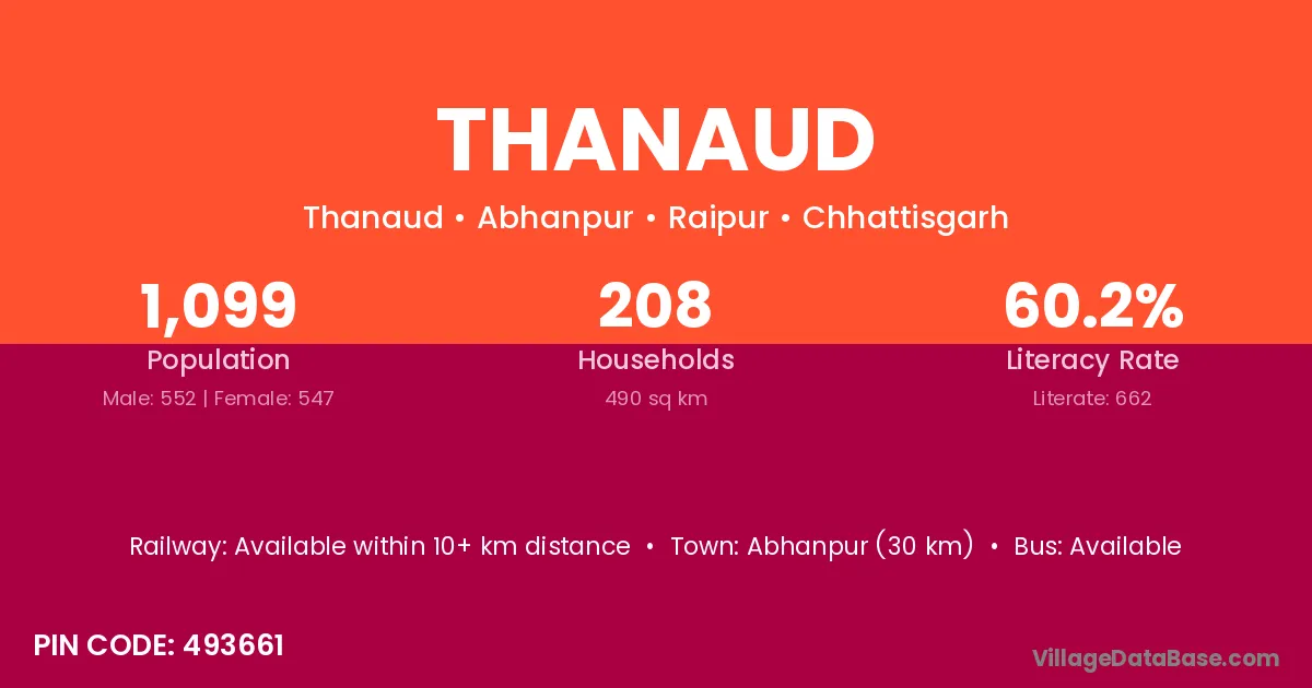 Abhanpur (30 km) is the nearest town to Thanaud village for major economic activities and is located approximately 30 km away.