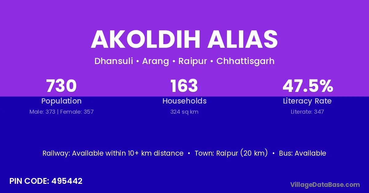 Raipur (20 km) is the nearest town to Akoldih Alias village for major economic activities and is located approximately 20 km away.