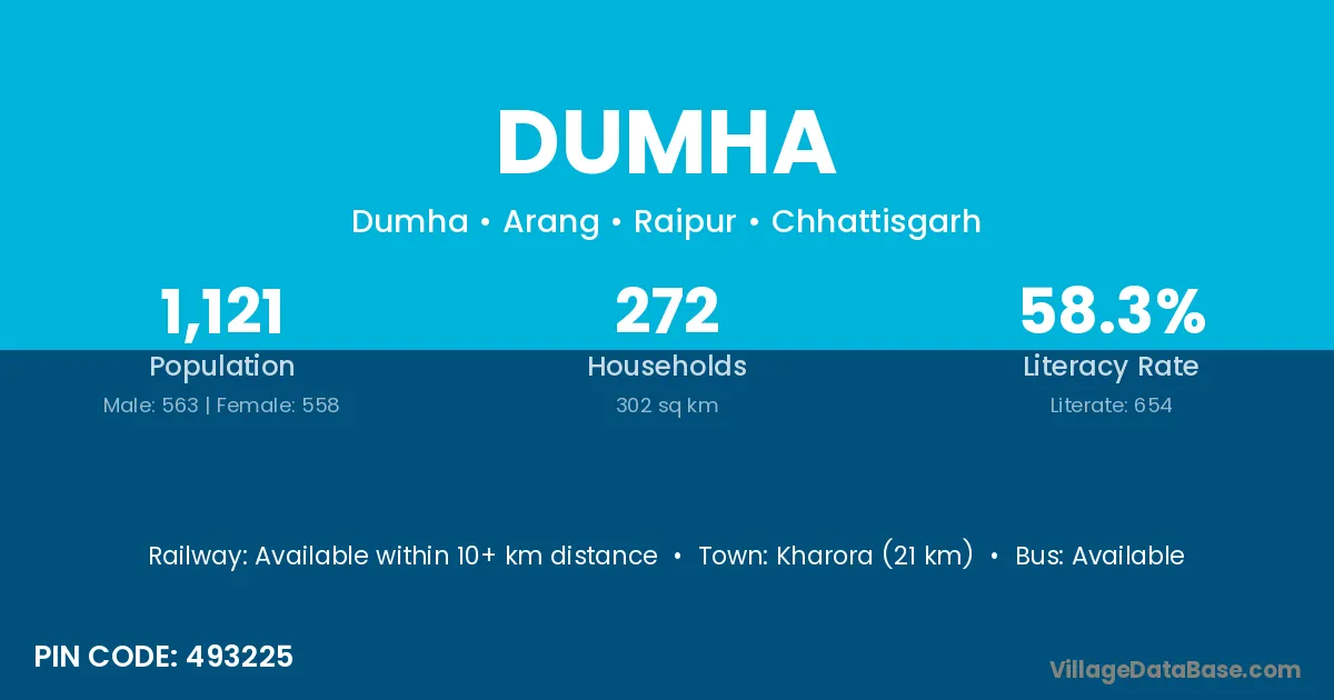 Kharora (21 km) is the nearest town to Dumha village for major economic activities and is located approximately 21 km away.