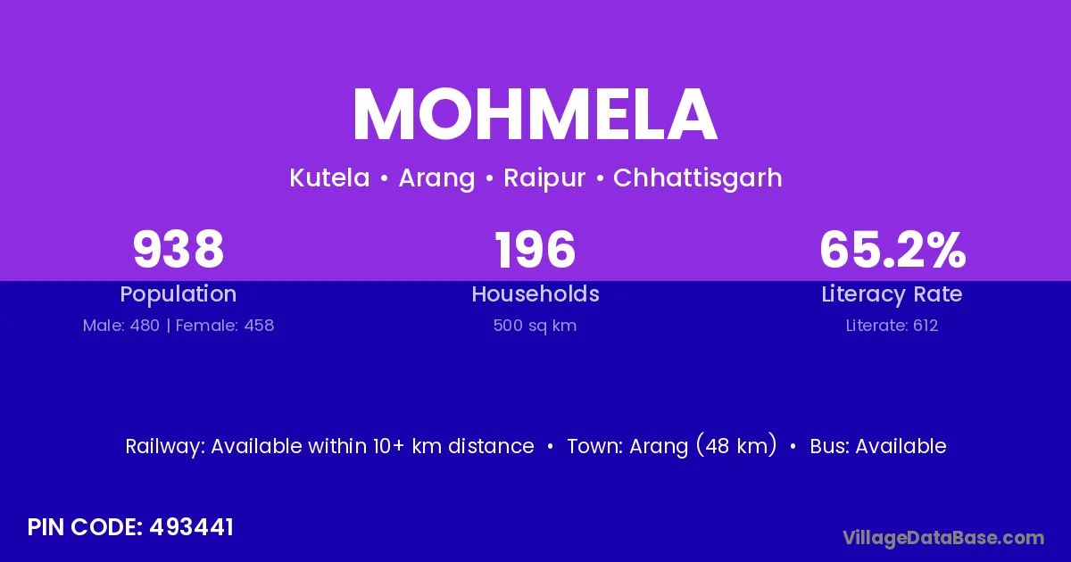 Arang (48 km) is the nearest town to Mohmela village for major economic activities and is located approximately 48 km away.