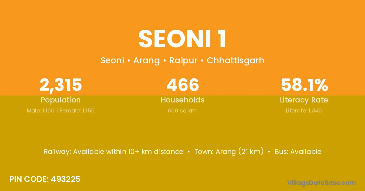 Seoni 1 village has a total population of 2,315 people, of which 1,160 are males and 1,155 are females.