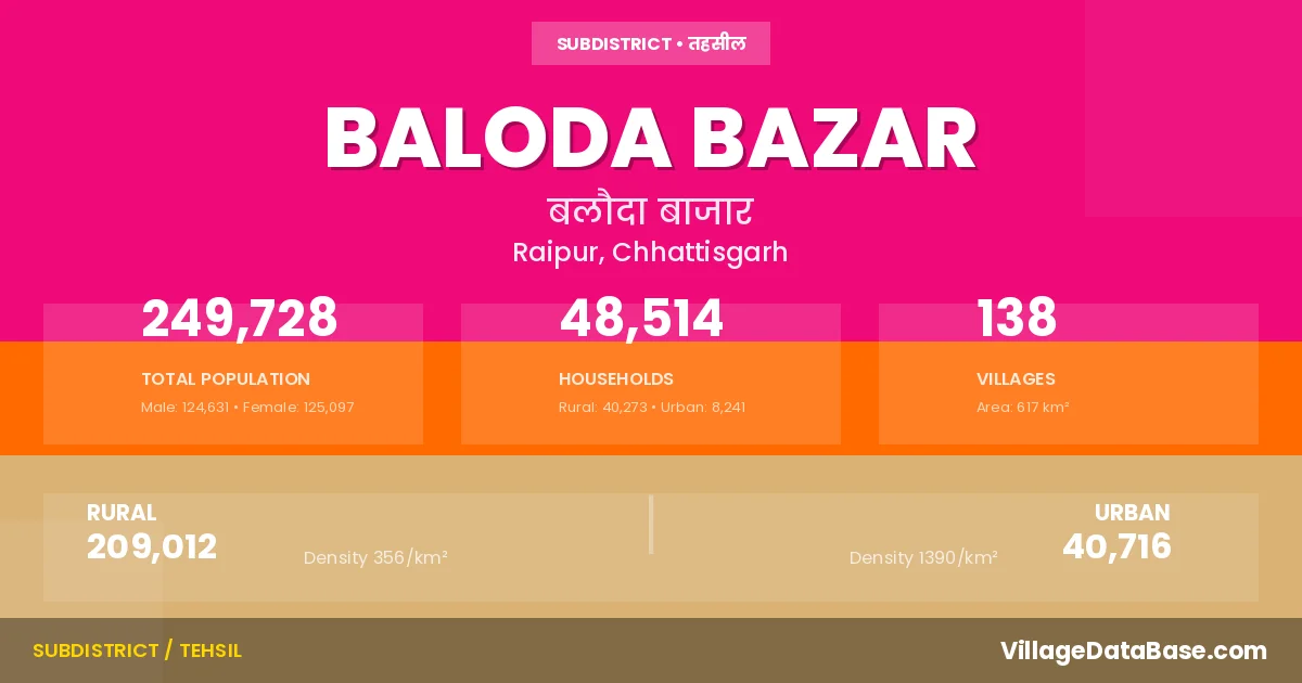 According to the 2011 census The total area of Baloda Bazar Tehsil is 617 km², with a population of 249728 people. The population density is 405 inhabitants per square kilometre, and there are approximately 48514 houses in the sub district.