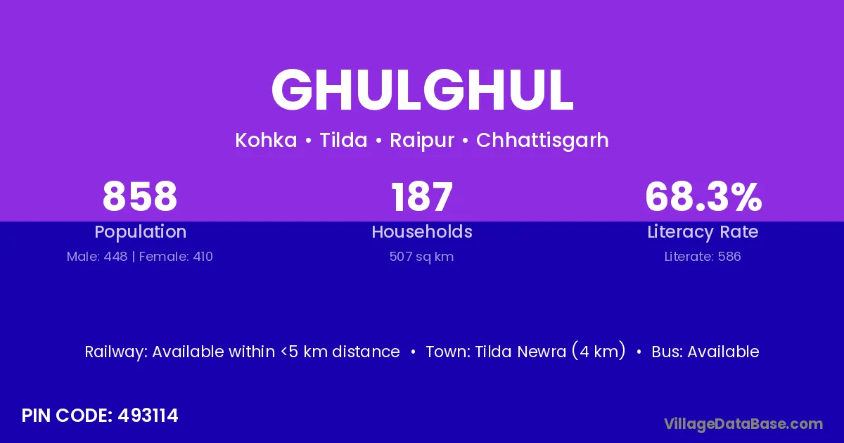 Baloda Bazar (10 km) is the nearest town to Ghulghul village for major economic activities and is located approximately 10 km away.