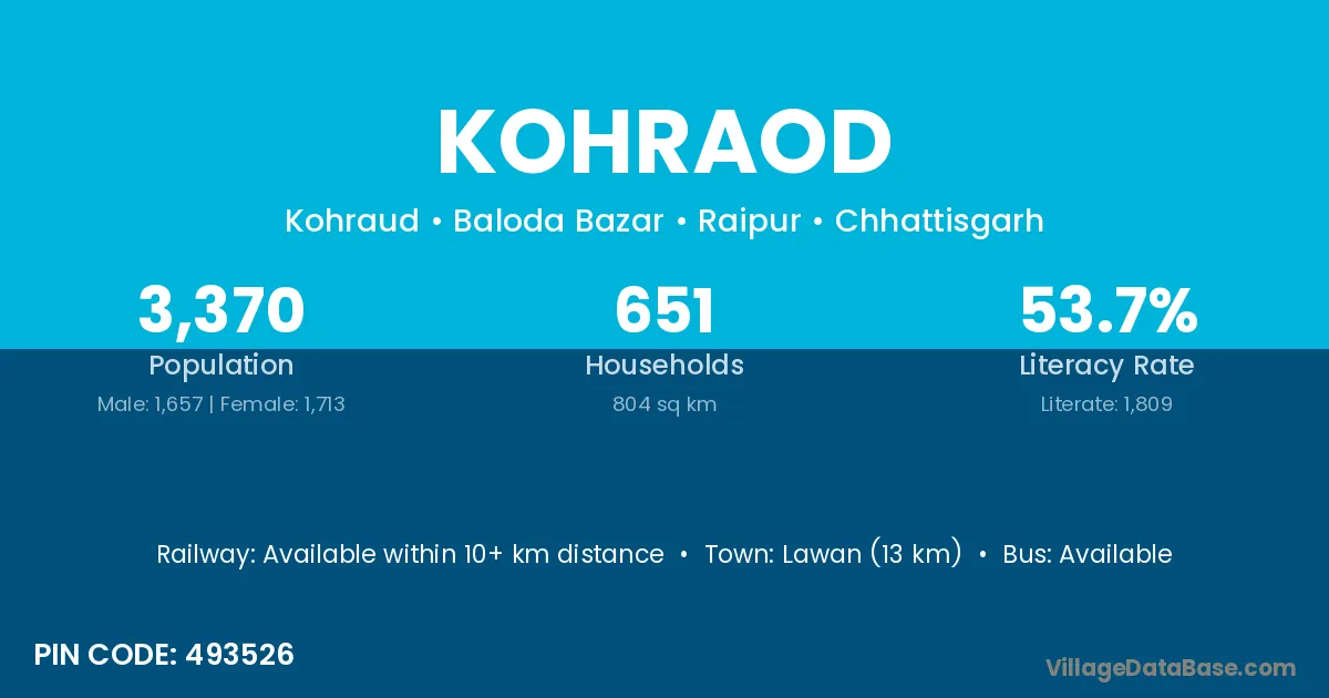 Lawan (13 km) is the nearest town to Kohraod village for major economic activities and is located approximately 13 km away.