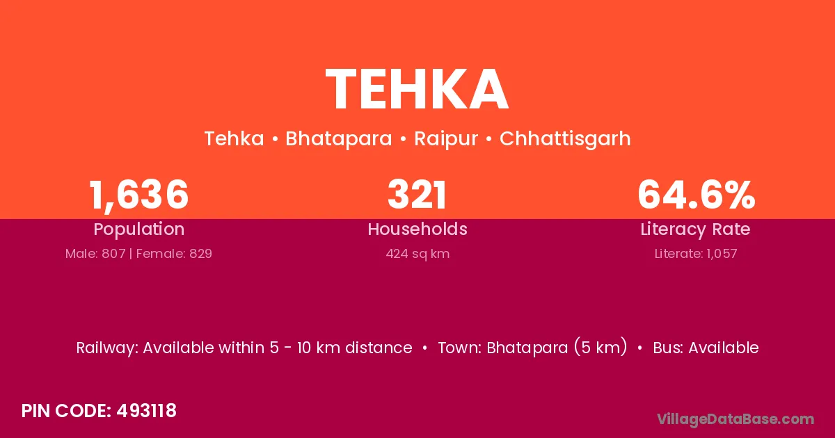 Bhatapara (5 km) is the nearest town to Tehka village for major economic activities and is located approximately 5 km away.