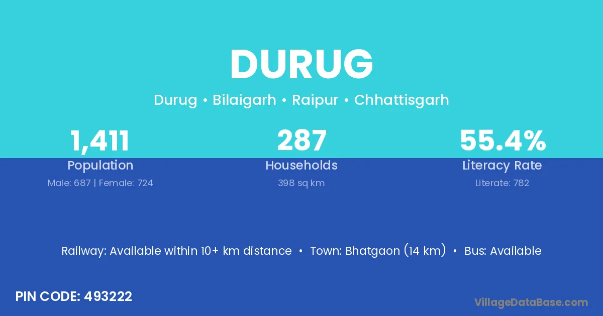 Bhatgaon (14 km) is the nearest town to Durug village for major economic activities and is located approximately 14 km away.