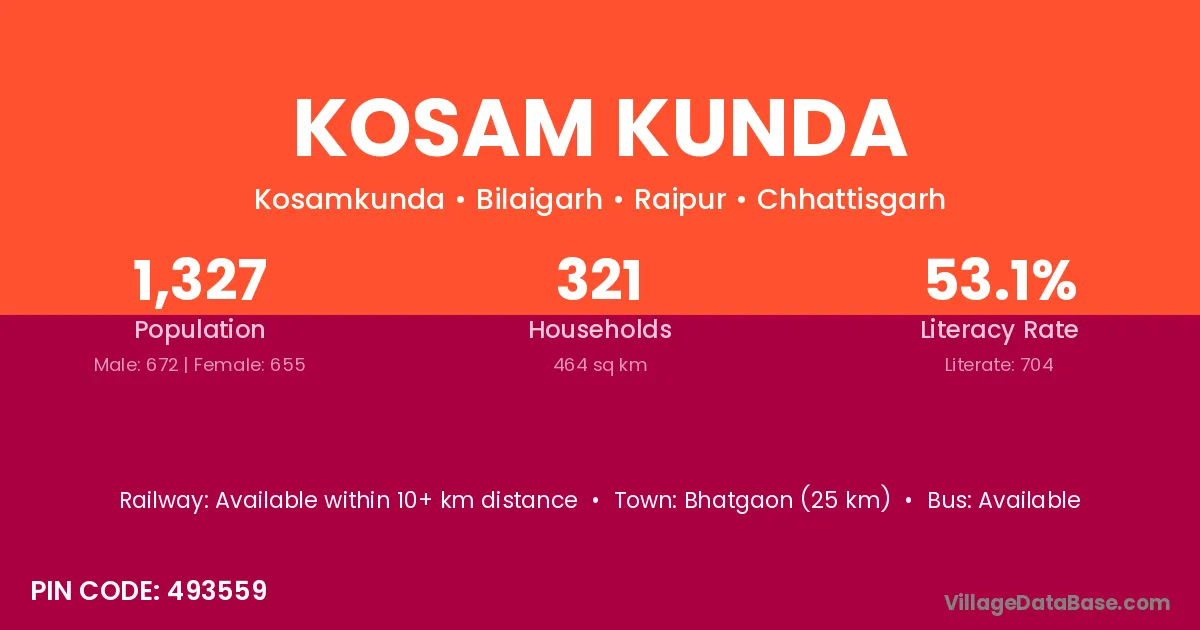 Kosam Kunda village has a total population of 1,327 people, of which 672 are males and 655 are females.