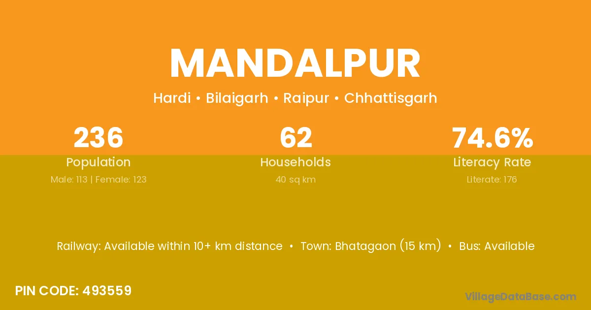 Bhatagaon (15 km) is the nearest town to Mandalpur village for major economic activities and is located approximately 15 km away.