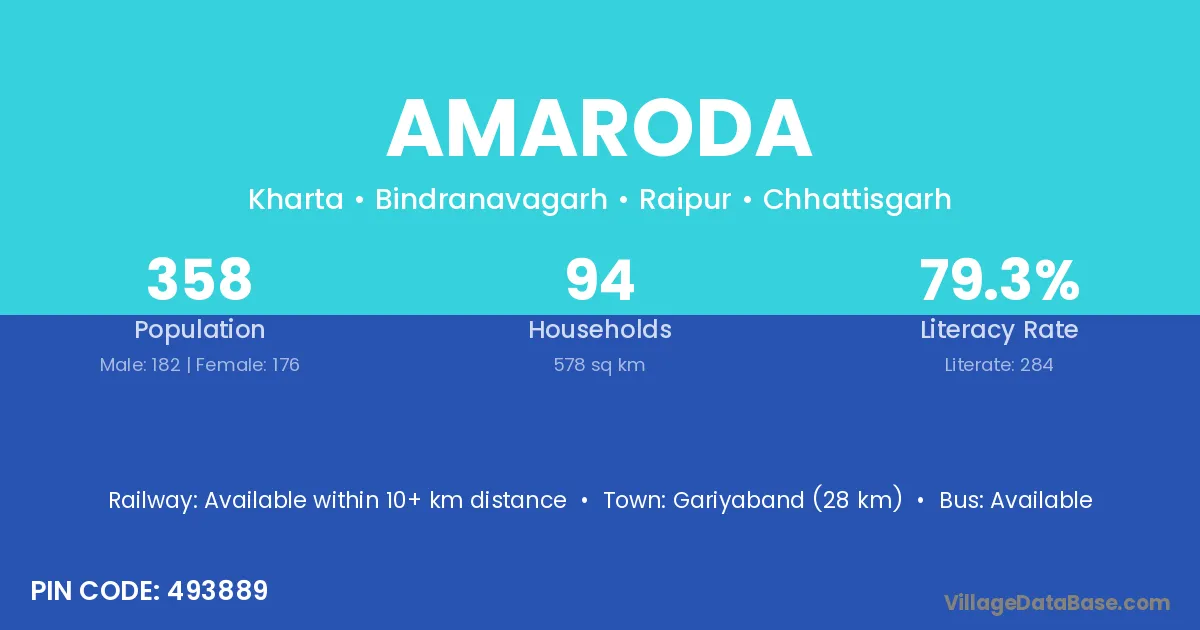 Gariyaband (28 km) is the nearest town to Amaroda village for major economic activities and is located approximately 28 km away.