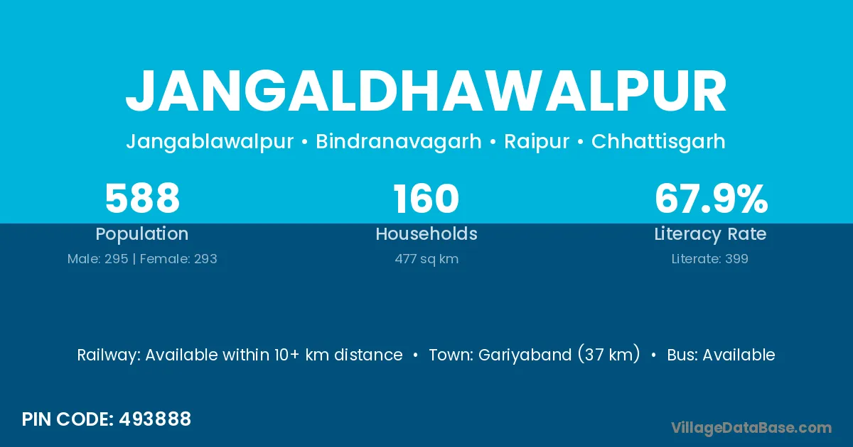 Gariyaband (37 km) is the nearest town to Jangaldhawalpur village for major economic activities and is located approximately 37 km away.