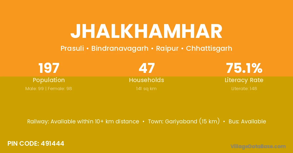 Jhalkhamhar village has a total population of 197 people, of which 99 are males and 98 are females.