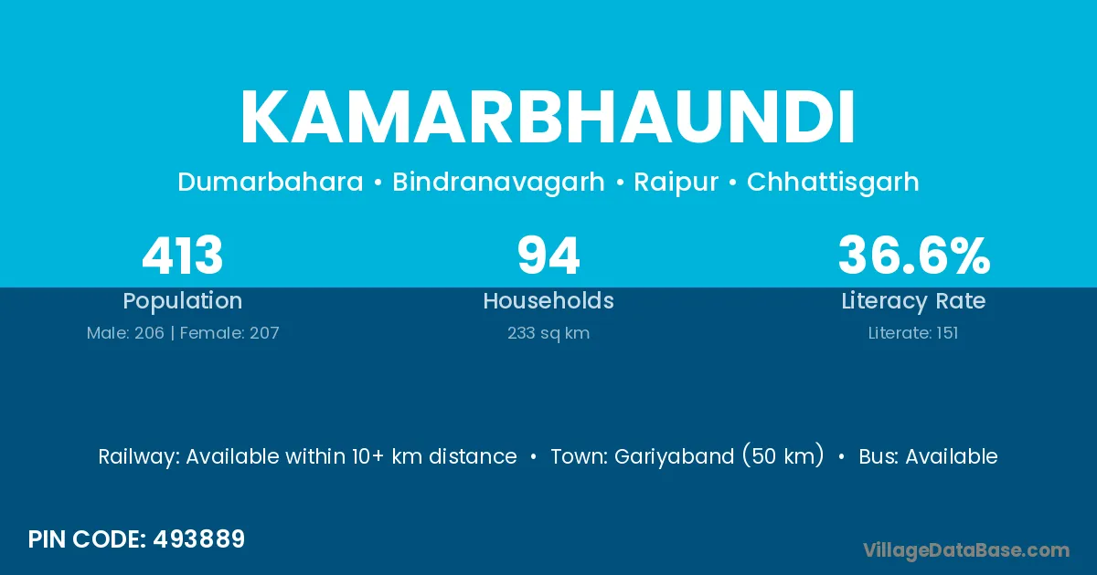 Gariyaband (50 km) is the nearest town to Kamarbhaundi village for major economic activities and is located approximately 50 km away.