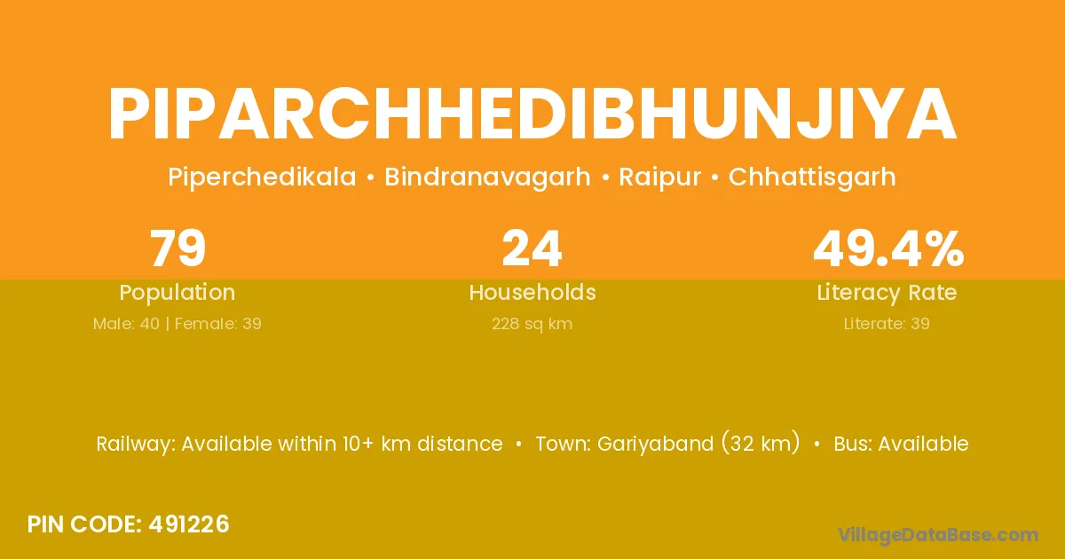 Gariyaband (32 km) is the nearest town to Piparchhedibhunjiya village for major economic activities and is located approximately 32 km away.