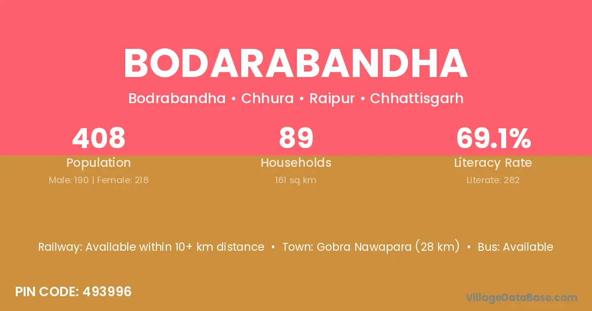 Gobra Nawapara (28 km) is the nearest town to Bodarabandha village for major economic activities and is located approximately 28 km away.