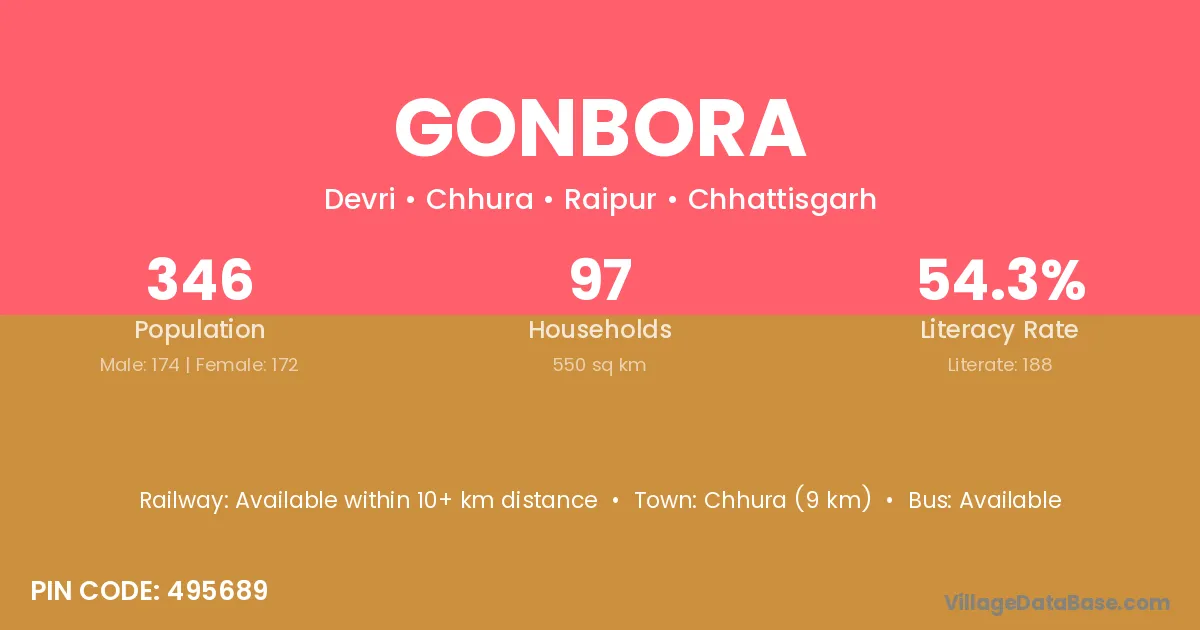 Gonbora village has a total population of 346 people, of which 174 are males and 172 are females.