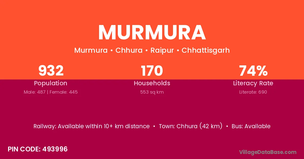Chhura (42 km) is the nearest town to Murmura village for major economic activities and is located approximately 42 km away.