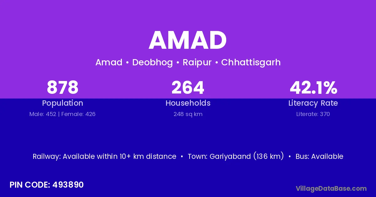 Gariyaband (136 km) is the nearest town to Amad village for major economic activities and is located approximately 136 km away.
