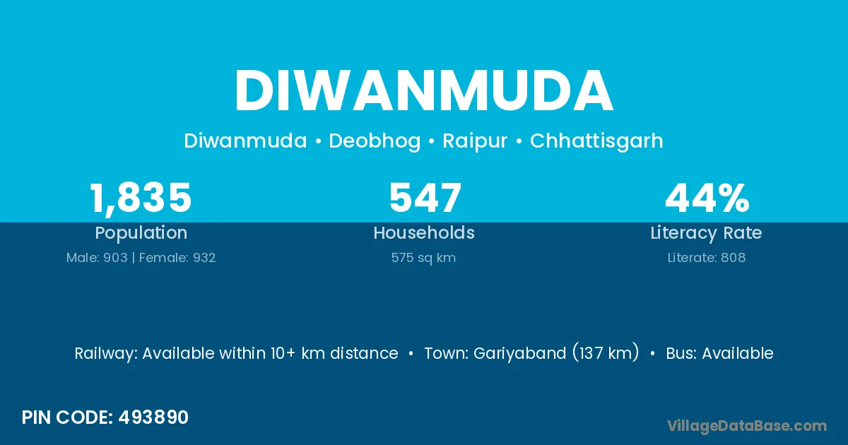 Gariyaband (137 km) is the nearest town to Diwanmuda village for major economic activities and is located approximately 137 km away.