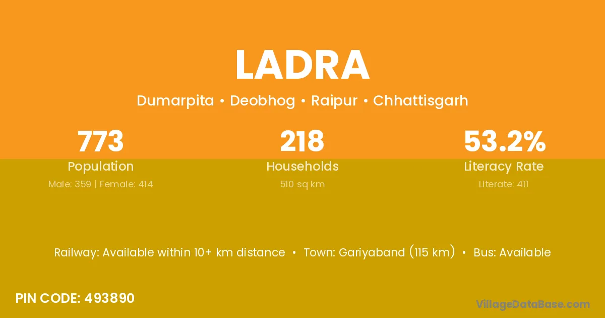 Gariyaband (115 km) is the nearest town to Ladra village for major economic activities and is located approximately 115 km away.