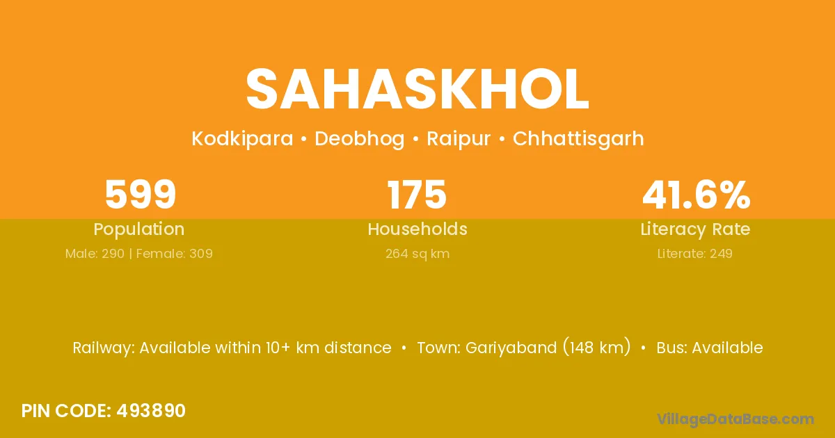 Gariyaband (148 km) is the nearest town to Sahaskhol village for major economic activities and is located approximately 148 km away.