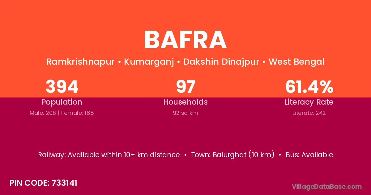 Bafra village has a total population of 223 people, of which 110 are males and 113 are females.