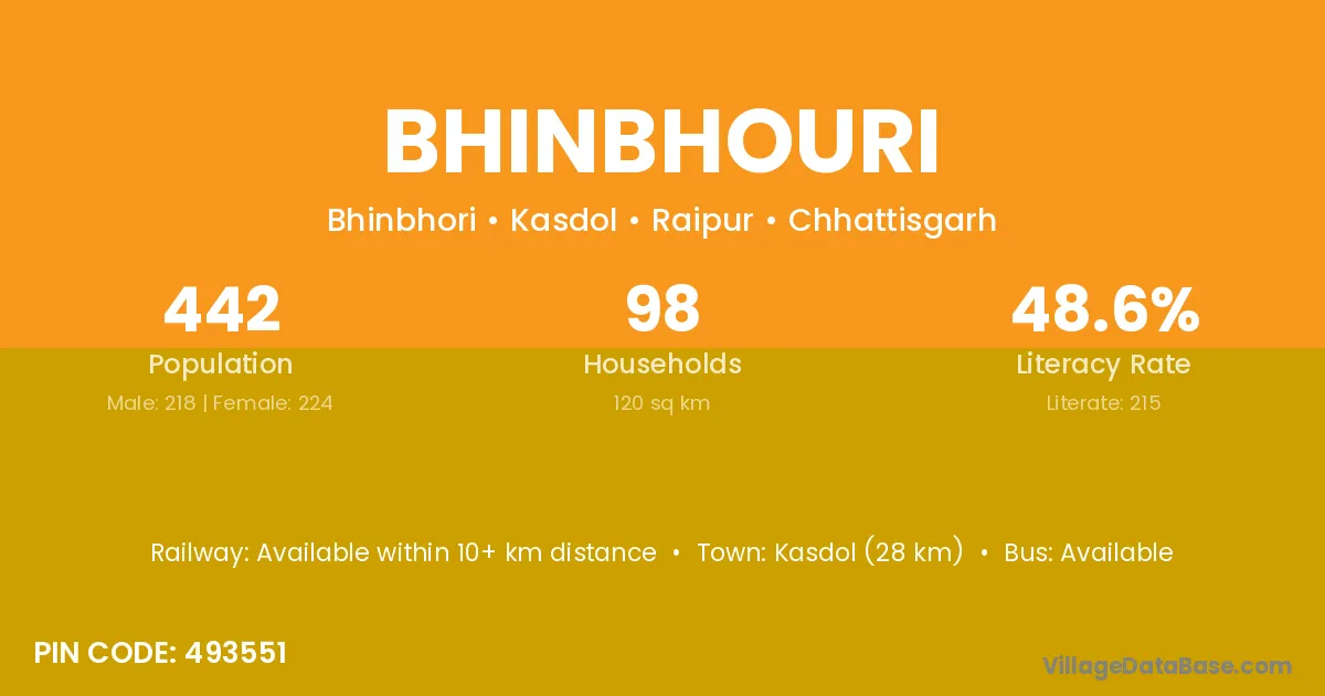Kasdol (28 km) is the nearest town to Bhinbhouri village for major economic activities and is located approximately 28 km away.