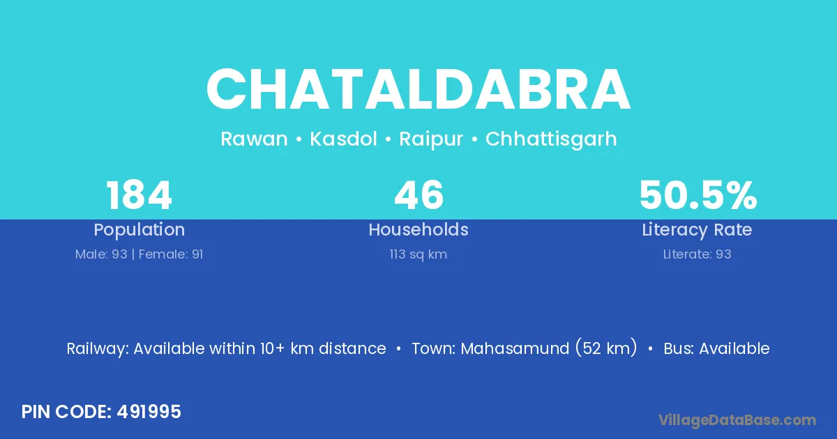 Mahasamund (52 km) is the nearest town to Chataldabra village for major economic activities and is located approximately 52 km away.